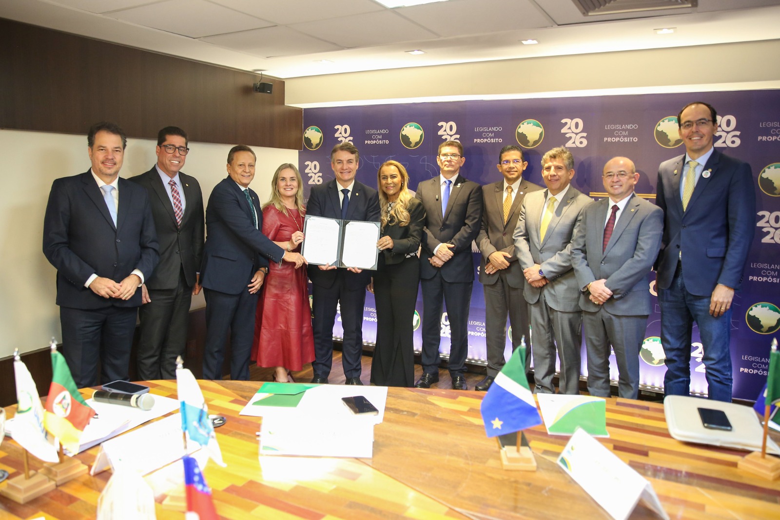 Já tomou posse a nova Diretoria Executiva da Unale para o ano de 2026, na sede da instituição, em Brasília. O novo presidente é o deputado Vilmar Zanchin ( RS) , o qual destacou o dever de assumir a presidência da entidade que representa todos os deputados estaduais do Brasil e que, há mais de 30 anos, cumpre um papel fundamental no fortalecimento do Parlamento Estadual.